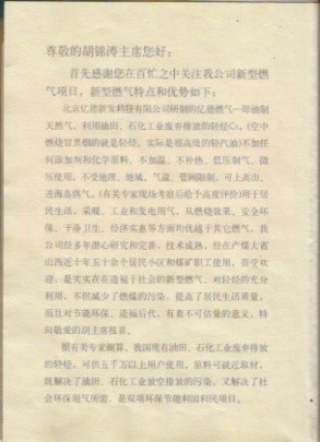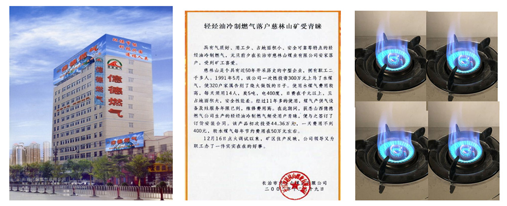 輕烴冷制燃氣,1993年前研究的也是加溫制氣,做了107戶供氣,輕烴加溫36度以上就產氣,天氣冷,每天多次排殘液、管道每天排3~5(水)桶凝液(輕烴),火勢不穩,也威脅安全,準備放棄改煤氣;國務院要求發展油制氣,研究不加溫試試,根據汽車用水降溫,摩托車用風降溫不拉缸原理啟示,不兌任何添加劑,將輕烴完全汽化,解決了殘液、凝液問題,專門改裝了1梯6戶,室外明管不保溫,在零下23度沒有凝液,經完善達到了供氣穩定的目的,承建了多個小區,常溫低壓供氣,使用穩定,找不到任何缺點;于2003~2005年八次向黨中央,國務院、有關部委報《喜報》:得到了大力支持,定為《國家鼓勵發展的資源節約綜合利用和環境保護技術項目》、《免稅項目》和《城市燃氣》。